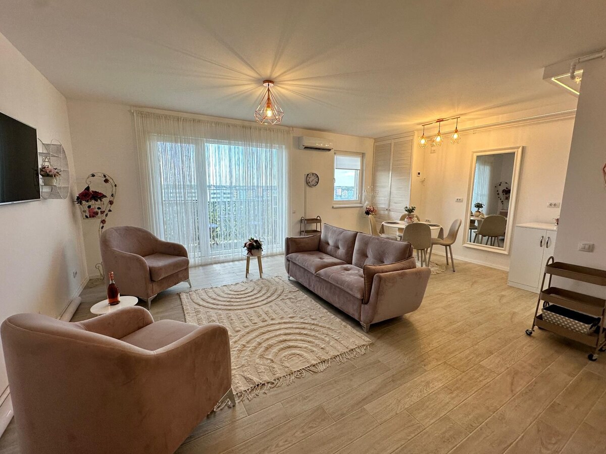 Welcome to Luxury East Apartment, a luxury apartment created to impress its guests with exclusive and tasteful decor. The furniture and details of the arrangement will surprise guests with the modernism and comfort of the luxury accommodation units, as well as with its high-end facilities. Located in a new and quiet residential area of Bucharest, the apartment offers guests privacy for a perfect and relaxing stay. Ideal for remote work Discounts for 28+ nights. Perfect for business projects.