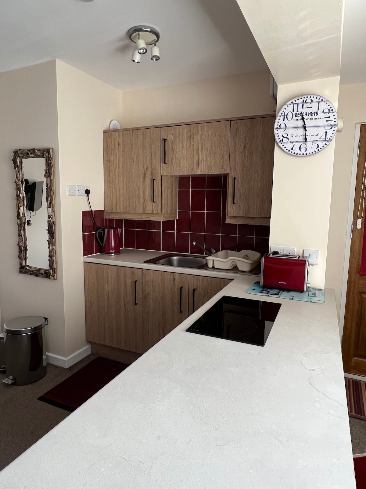 Lovely large studio style room with a very comfortable super king size bed, the bed can be separated into single beds, there is an ensuite shower room, kitchenette & a separate entrance. Property has a large driveway with off-road parking for guests and private courtyard. Property is on the ground floor with one small step into porch and one small step into the studio flat. Llyswen is situated on the village high street, a 5 minute walk to the beaches.