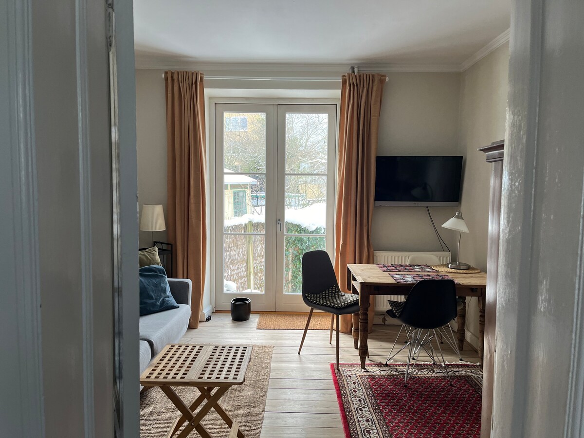 Lovely bright 2-bedroom apartment overlooking the south town. The apartment is furnished with a double bed (180X200 cm), sofa, dining table, etc. The kitchen is equipped with pots/plates, etc. like a holiday apartment. There is a toilet in the apartment and access to the bathroom in the basement. There is the possibility to use the garden with a lovely terrace. The apartment is close to shopping and with good bus connections, there are 250 meters to the nearest stop. 4A and 11 often go into town. Free parking on the road.