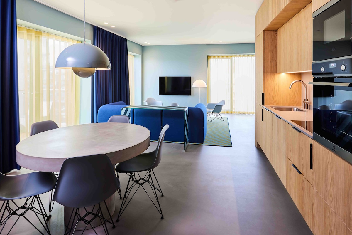 Enjoy the glamour A one-bedroom apartment (84 m2) with room for up to 3 adults. This apartment is fully furnished, with high-class, high-comfort designer interiors. The blue colours create unity throughout the entire apartment and tastefully harmonise every room.