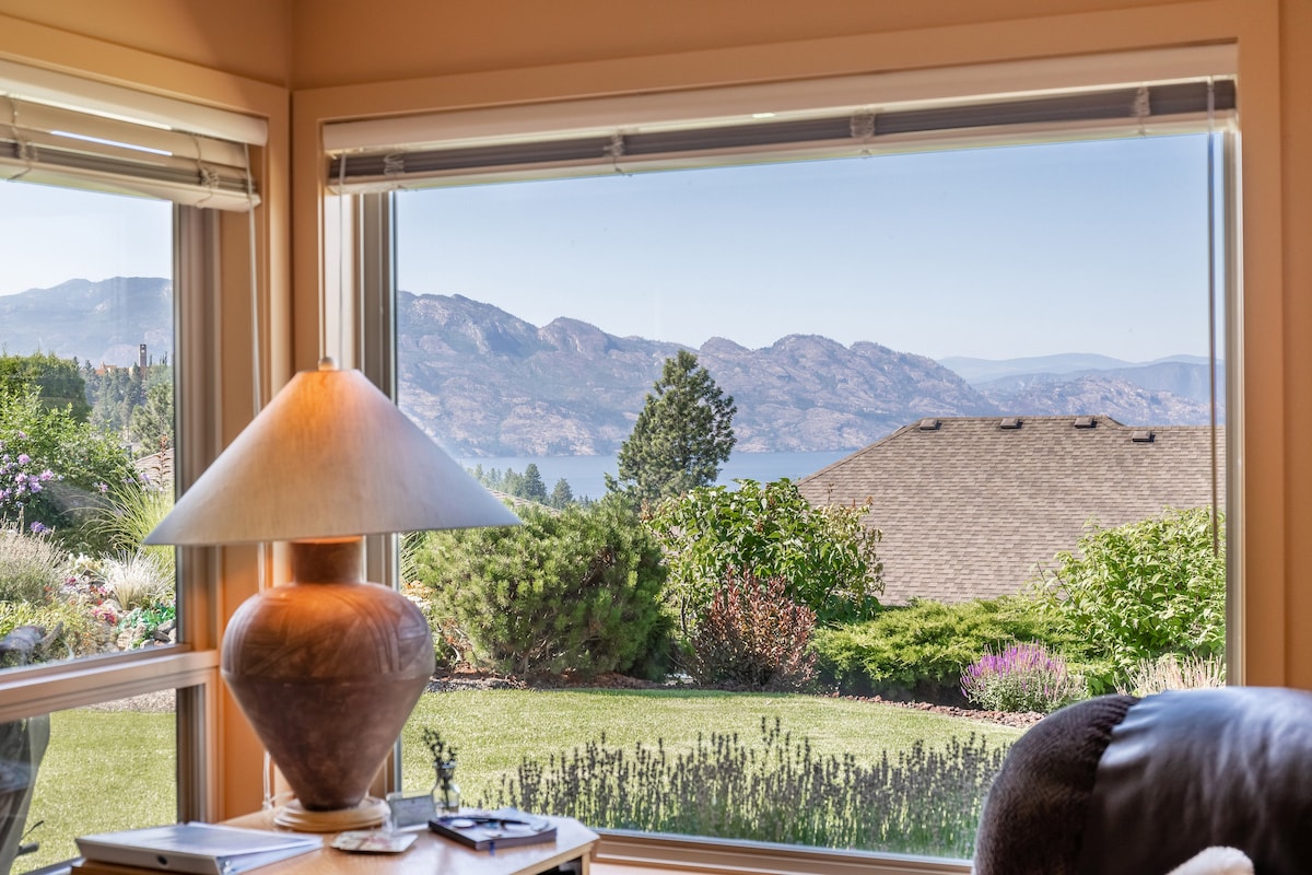 Enjoy stunning lake and mountain views from this beautiful room with floor to ceiling windows. The suite has its own private entrance and patio. Perfect for unwinding after a day of exploration, relax with a refreshing rain shower, slip into a comfy bathrobe, and enjoy a glass of wine from the comfort of your room. Located near Kelowna and Knox Mountain, just 7 minutes from downtown and beaches, our Airbnb is your ideal peaceful retreat.