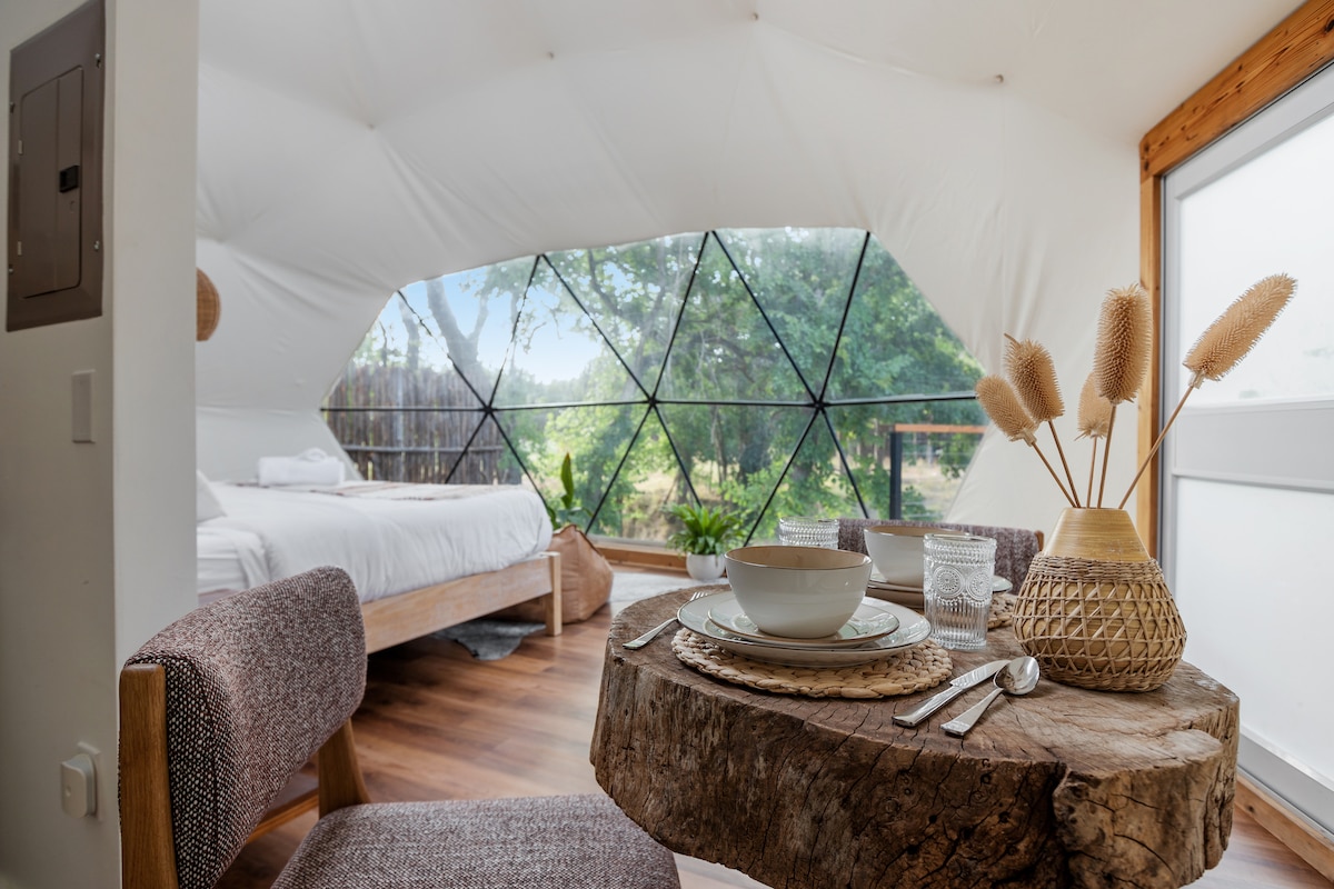 The Cedars Ranch is a stunning glamping resort and event venue on 20 acres in the heart of Texas Hill Country. Amenities include a resort-style pool with cabanas, pickleball courts, bocce ball, walking paths, outdoor games, and more! Spherical dome one-bedroom suite with huge panoramic curved window allowing guests to lie in bed and view the natural scenery without leaving their cozy home. King bed on the main floor, additional queen bed in the loft, small kitchenette, and full bathroom.