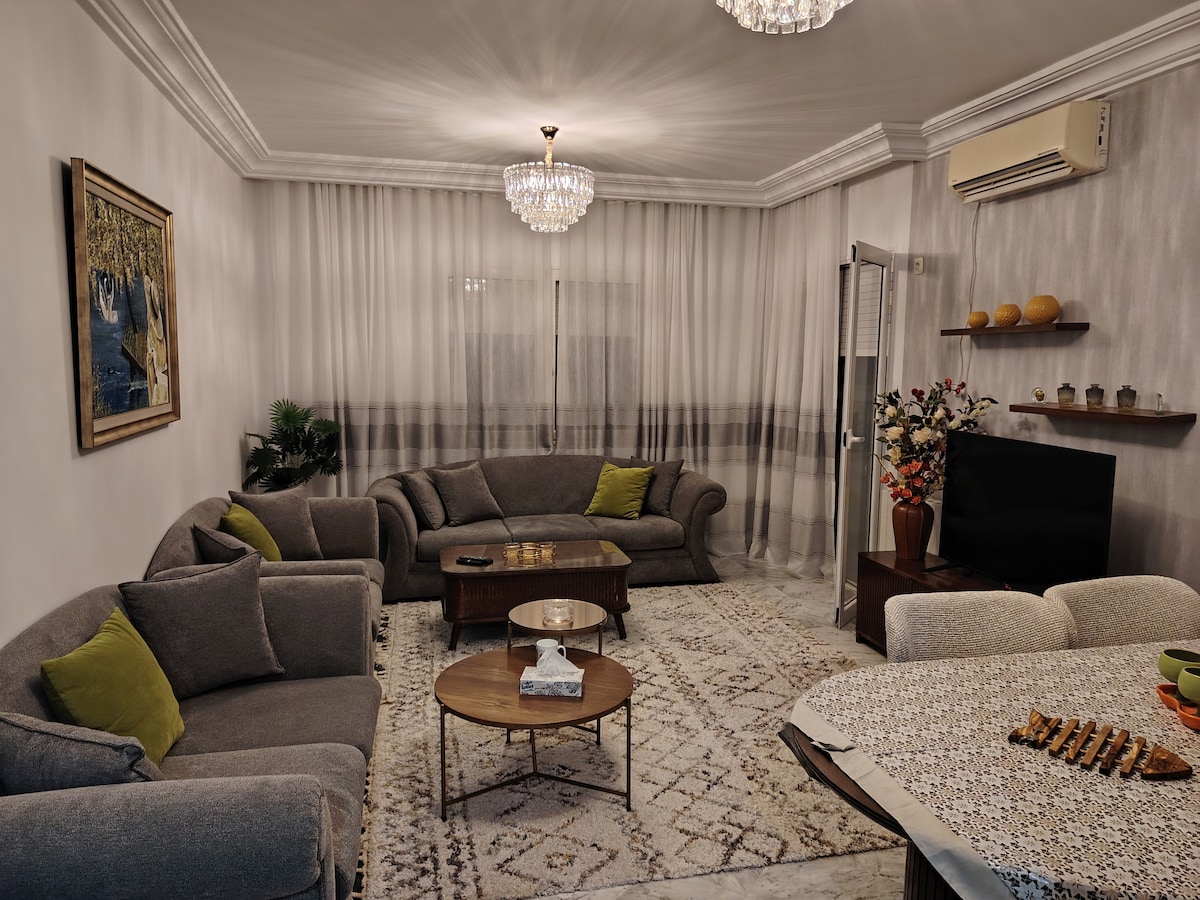 Relax with the whole family at this peaceful place to stay. Discover this charming apartment ideally located in Tunis, just minutes from the airport and downtown, this space offers all the comforts necessary for a pleasant stay The kitchenette has all the necessary equipment (plates, glasses, cutlery, fridge, microwave, stove, simple coffee maker, pots, utensils, washing machine, iron and ironing board and more.