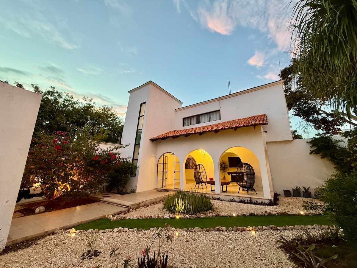 Relax in this unique and peaceful getaway, distinguished by its exuberant vegetation, accompanied by the singing of birds at sunrise and sunset, located 5 minutes from Paseo Montejo on foot and 20 minutes from the historic center of Mérida, buses to progreso every 10 minutes in front of the house and to get dowtown in the corner very 5 minutes. The guest house is located within the 5,000 m2 where the main house is also located, the only thing shared is the pool.