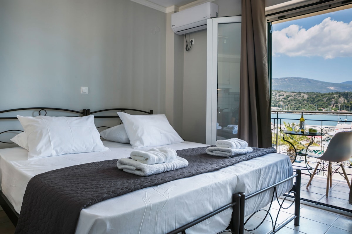 Deluxe Studio Sea View with daily a la carte breakfast at Joy Bistro. Fall asleep with the sound of the waves and wake up to the endless blue of the Ionian Sea in the background at this comfortable studio apartment. The Deluxe studio accommodates two guests, and features a comfortable area of 32 sqm with double bed, a kitchenette and dining area with panoramic views over the Ionian Sea.