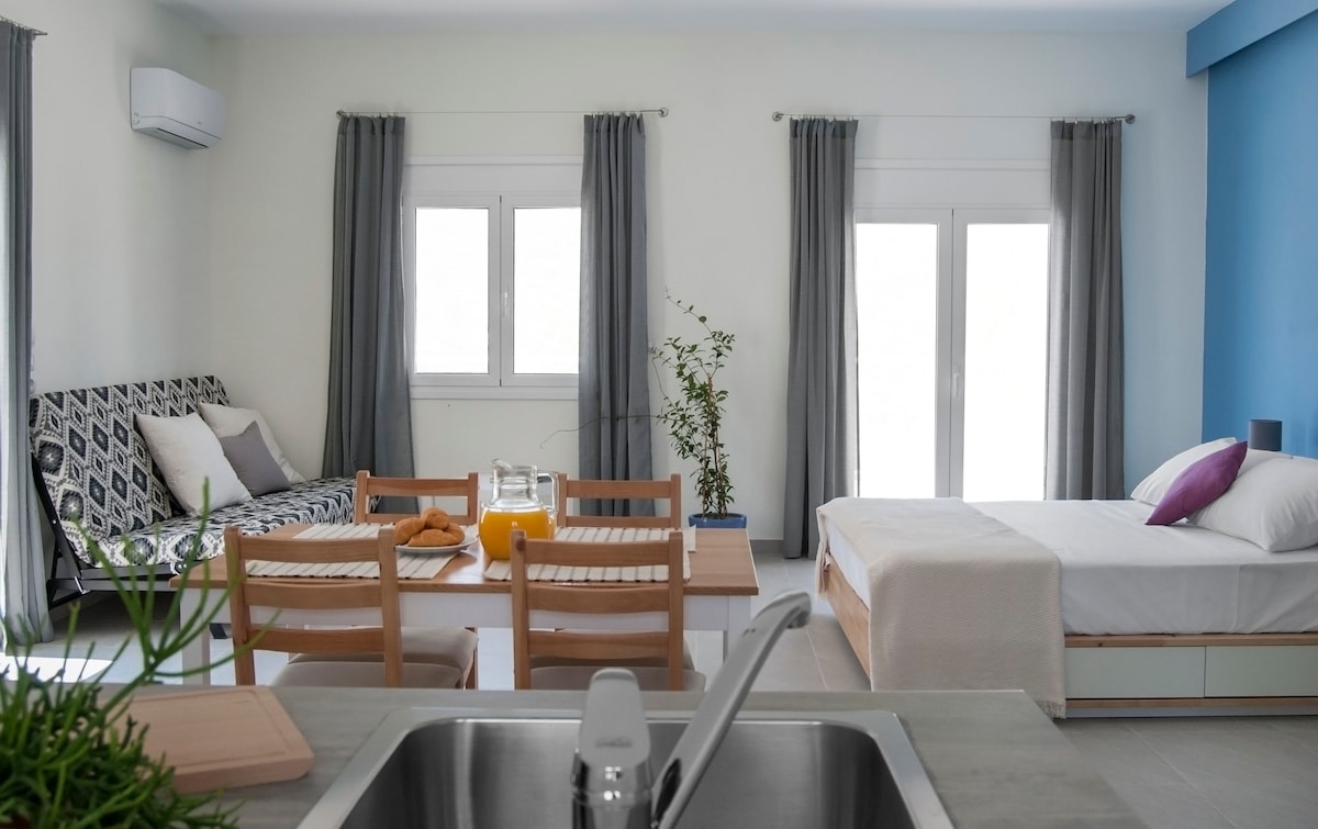 Deluxe Studio Sea View with daily a la carte breakfast at Joy Bistro. Fall asleep with the sound of the waves and wake up to the endless blue of the Ionian Sea in the background at this comfortable studio apartment. The Deluxe studio accommodates two guests, and features a comfortable area of 32 sqm with double bed, a kitchenette and dining area with panoramic views over the Ionian Sea.