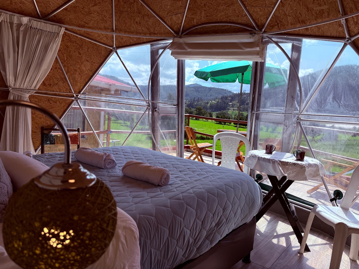Ven a disfrutar de la tranquilidad y conectar con la naturaleza! Ensueños es una cabaña glamping de lujo, tiene diseño con aires mediterráneos en un entorno natural pero con todas las comodidades. Se encuentra ubicada a 7 minutos de las piscinas termales y el lago Sochagota de Paipa. El espacio: 🍽️ Cocina equipada 🚿 Baño privado agua caliente 🛏️ 1 Cama doble y 1 cama nido semidoble 📺 TV Smart 🛜 Wifi 🅿️ Parqueadero gratis 🪻 Entorno natural Número de registro 230546