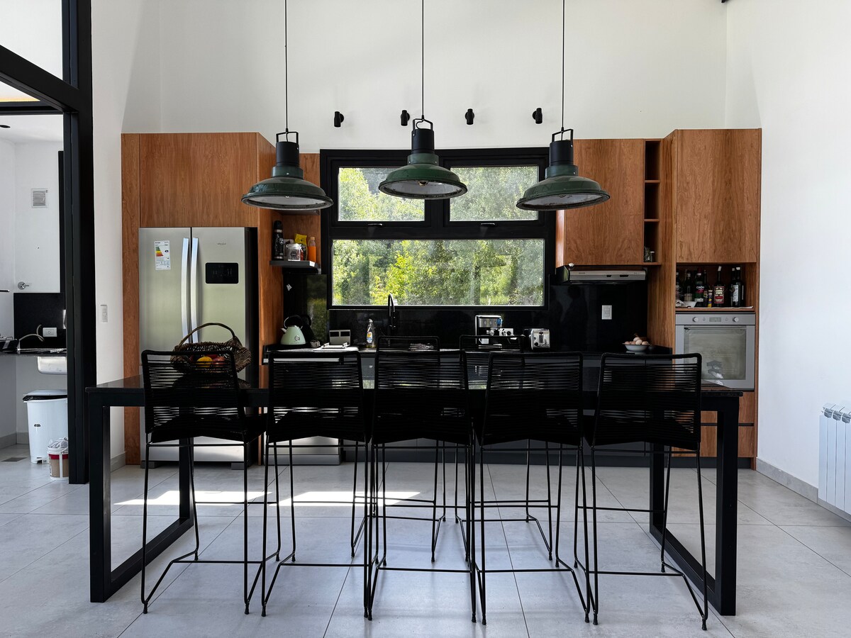 The building has a modern style combining stones, wood and masonry. Large windows let in light all day long and make it possible to connect better with the natural environment and a beautiful view of the mountain range . The uneven terrain, native plants and trees and an attractive natural stream, spread over half a hectare, complete a composition that allows you to have moments of complete tranquility. The house has a generator, alarm and heating by radiant dishwasher.