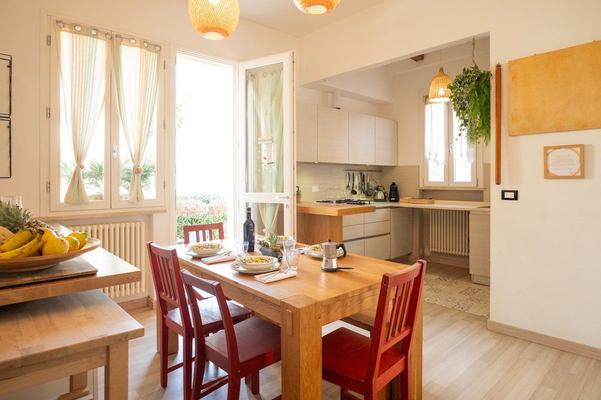 In the center of Cesenatico and within walking distance of the sea, you will find this large ground-floor house with an entrance and a large private garden. A room with a double bed where you can add a third bed or crib. Double/triple room. Two bathrooms. Living room with sofa bed, study desk. Equipped kitchen and dining room. Washing machine. Large green spaces with turtle pond, outdoor table and chairs, children's hopscotch. Bicycles available to guests. Beach towels.