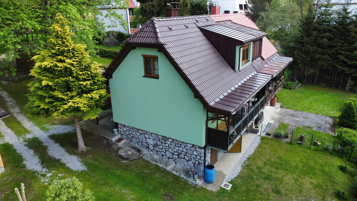 Samostatně stojící dům jen pár metrů od bobové dráhy v Lipně nad Vltavou. Dům nabízí prostorné pokoje, pro 12 - 14 osob, velkou jídelnu - společenskou místnost, vybavenou kuchyň včetně mikrovlnné trouby a myčky, prostornou terasu s grilem, pergolu pro děti, vyhřívaný bazén se slanou vodou, velkou zahradu, hernu, Wii, netflix a WI-FI. Dostatečný prostor pro parkování až 5 aut. Pěšky 10 minut do Lipenské Mariny, supermarketu a lyžařských vleků, 15 minut ke stezce v korunách stromů.