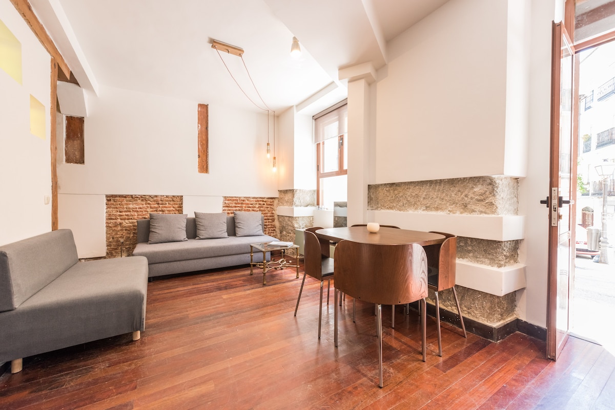 Unique loft in Malasaña offers an exclusive experience. Independent entrance from the street. Fully equipped kitchen, bright living room with window to the street, room without door and solid wood columns, create a cozy and elegant atmosphere, The bathroom, in an old brick vault in the basement by stairs, brings a historical touch that makes this place a unique space. Ideal for couples, it is the perfect place to enjoy a Madrid stay in the heart of the city