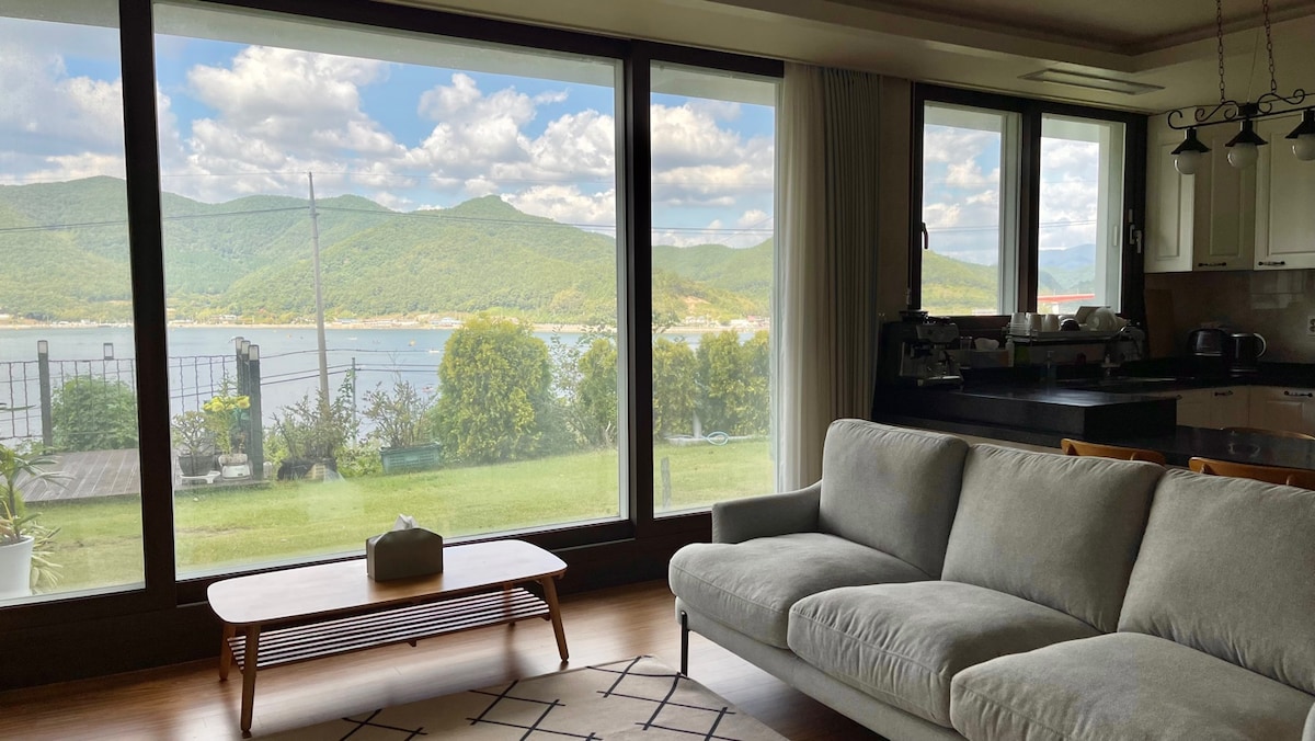 ★ The 1st floor cafe/restaurant is currently closed. ★ From Montre to the Goseong Dinosaur Expo Hall, you can use a great drive course that runs right next to the sea. It takes 15-20 minutes by car, and we strongly recommend that dinosaur expo visitors stay comfortably in Montre and enjoy the beautiful drive course. Enjoy the beautiful Dado Island while enjoying the spacious courtyard in the private house on the 1st floor of Montre. Since the opening of Montre Airbnb, many people have visited. The first floor was rented only to those who requested it, but as the number of requests gradually increased, it was newly decorated with flowers and opened to the first floor. ♥ Fantastic view of Dadohae seen through the window ♥ 30 sqm private house, spacious living room and 2 bedrooms, healing in a marble fireplace room that you can light a fire yourself ♥ Exclusive use of the open courtyard and terrace space in front of the 1st floor cafe ♥ For group use, rent a cafe on the 1st floor (contact the host by phone 01038710057) Please check the special advantages of the private house on the 1st floor of Montre and use it for many people.