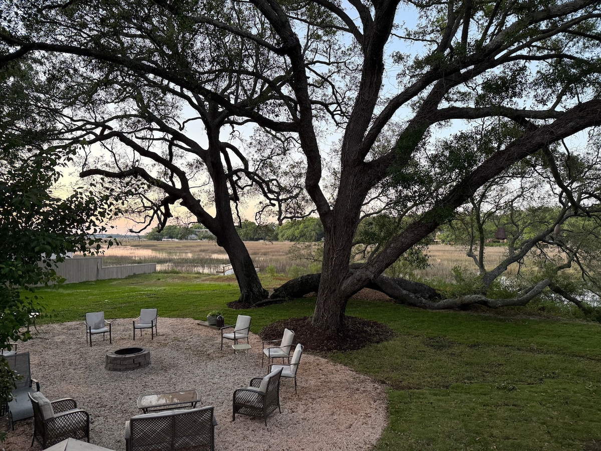 Relax with the whole family at this peaceful place to stay. This beautiful waterfront home would be a perfect vacation home for families. The home has 3 bedrooms, 3 and half bathrooms, a gourmet kitchen, large family room, gorgeous dining room, sunroom and a playroom which is considered our 4th bedroom with a sleeper sofa with a plush mattress and a closet. The home is directly on the water and has a large lawn with a fire pit area and picnic spaces. About 15 minutes to downtown Charleston.