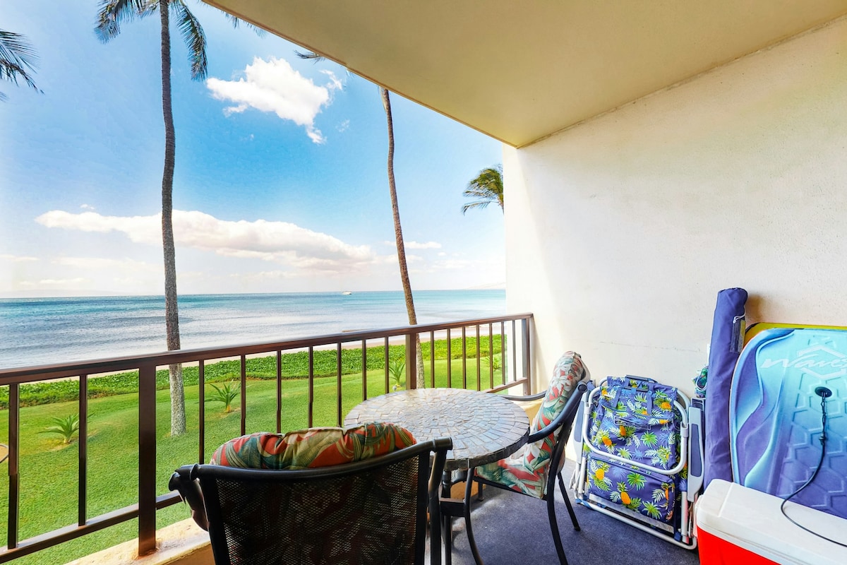 Top floor, corner unit, with stunning ocean and mountain views, just steps from the beach. Stay cool with brand new central AC. Watch thousands of humpback whales, visible from the lanai. See huge green turtles beached or dip in the water right along with them. A fully furnished 1 bedroom, 1 bath, covered lanai, fully stocked kitchen, with washer and dryer for all your relaxation needs. Pool with hot tub and bbq/ pavilion area and parking onsite.