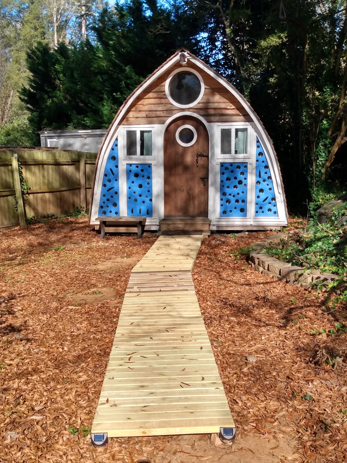 Ahoy, travelers, welcome to the Boathouse! This Tiny House is 144 sq ft. and is totally unique in design and craftsmanship. From the porthole windows, to the bottle-bottom glass walls, guests will delight in the unique features of this "port-in-a-storm." Perfect for overnight guests, the Boathouse is a glamping-type experience, with a lot of luxury tucked into a tiny space. Keurig coffee maker, A/C, and comfy cotton sheets are just a few features and even better, it's PET FRIENDLY!