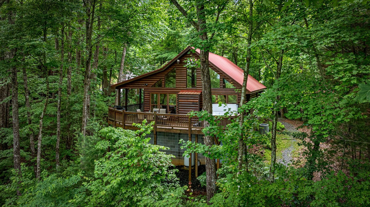 Picture driving up a winding, mountain road—wrapped in trees. Near the top, your rustic log cabin overlooks magnificent mountain views. You can breathe. Inside, a spacious living room with comfy furnishings, Big Screen TV, and cozy fireplace. An expansive covered deck beckons w/ wondrous views. Explore the woods, grill up a meal, or soak in the hot tub. Near hiking/mountain bike trails, you’re away from the crowds—but only 9.5 mi. to Downtown Blue Ridge.