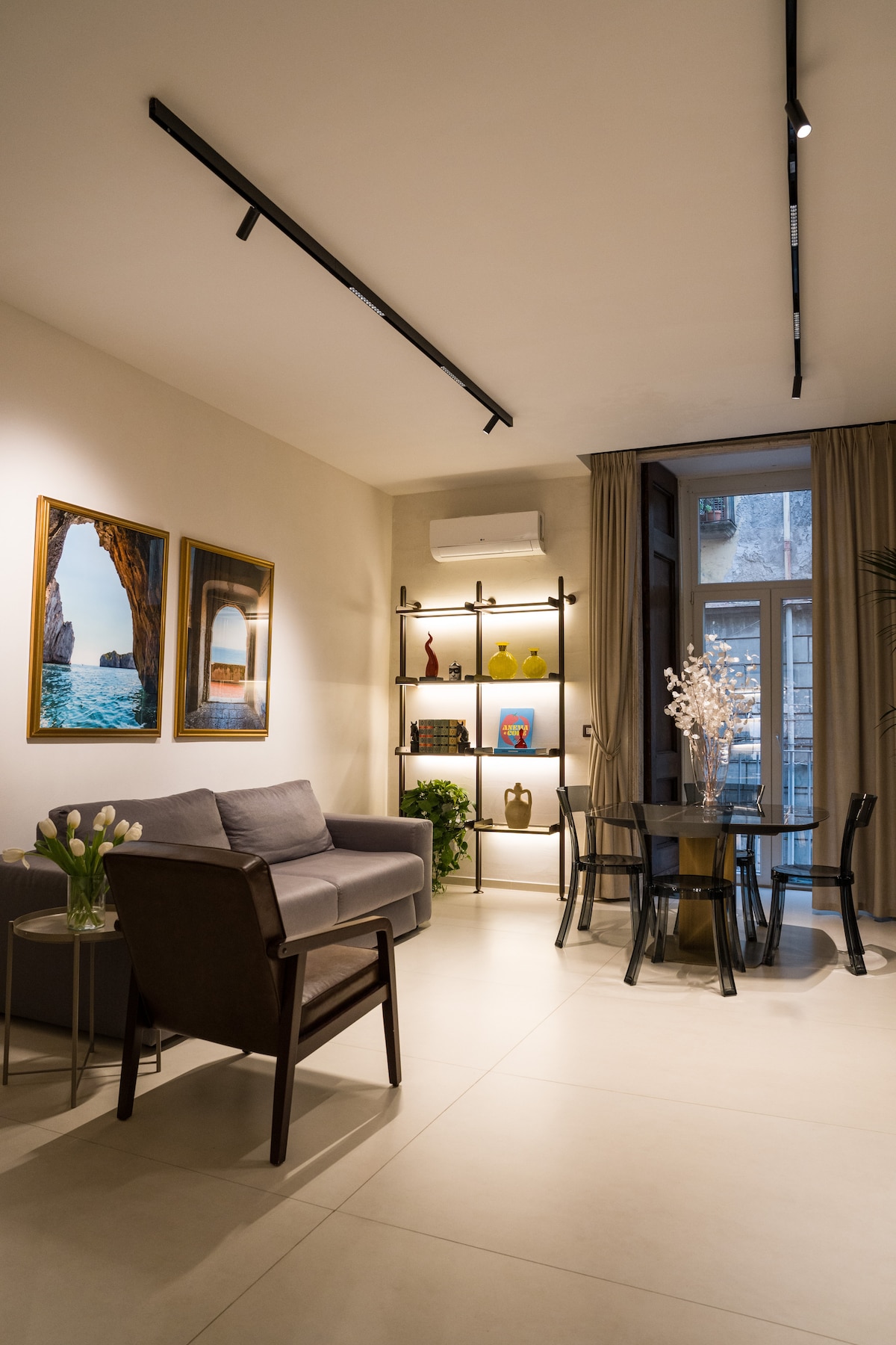 The apartment, just a 3-min walk from Amedeo Square (Metro L2, Funicular, Taxi Station), can host up to 5 guests and provides all the comforts for a relaxing stay in the heart of the elegant Chiaia district. The main spaces are: two cozy bedrooms with ensuite bathrooms, a spacious sitting room with a sofa bed, and a bright dining area with a handcrafted kitchenette. The interiors feature Liberty-style wood doors and frames from 1909, harmoniously balancing rustic elegance with modern amenities.