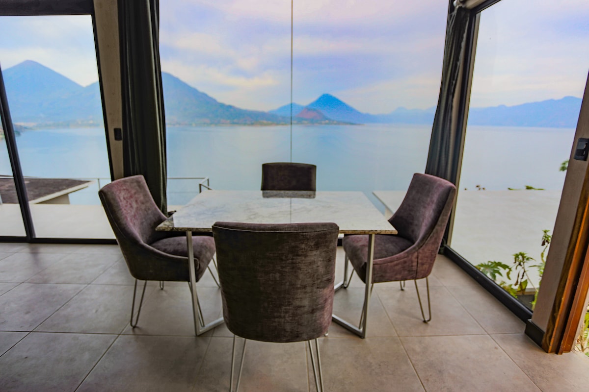 Very Unique & Modern Luxury House up in the Guatemalan Highlands with the sensation of floating up in the sky (1700m) -Features unobstructed Starlink connection with 24 hours of unbroken electricity (lithium/solar) -All windows folds fully open to greet the breathgiving views of 5 vulcanos and the “infinity lake” of the ever changing “painting” -Filtered spring water on tap -Bathroom hot tub for a closed or open door experience -12 m2 cantilevered hammock deck-net for stargaze & relaxation