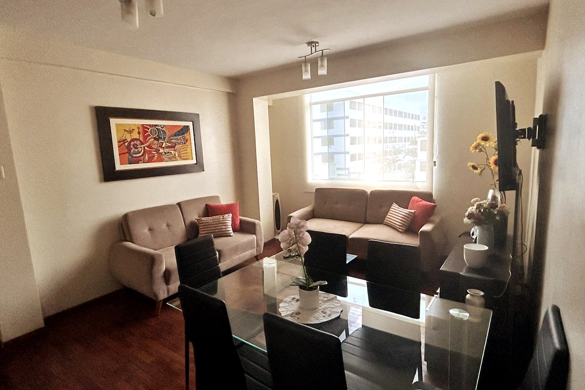 Welcome to your apartment in Chiclayo! Discover the city of friendship by staying in this modern and cozy apartment. Located on the second floor of a building with 24/7 surveillance, our space offers street views and access to all common areas. It's the perfect place for families or groups of friends looking for comfort and safety. In addition, your stay includes a garage (suitable for cars and SUVs) and if you are traveling for business, we can issue an electronic invoice.