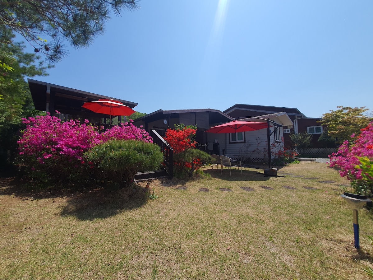This special space includes a private accommodation and a very spacious outdoor space. All spaces are only open to bookers while you're here. Enjoy the fire pit at night while watching the stars and the moon. You can enjoy a comfortable space atmosphere and music with squid lights and LED lights until dawn. When it snows and rains, looking at the valley, the barbecue in the bungalow is another happiness. There is a playground and a foot net, so don't forget to exercise such as foot golf and badminton foot baseball. After Yongmunsan and Jungwonsan hiking trails, soak your feet in the clear valley next to the pension and enjoy healing. The Vally view room is a room where you can lie on the bed and look at the valley. Garden view rooms are rooms with more space and a private garden and playground. Depending on the number of people, you can use only one of the two independent rooms. For an additional fee, you can use both rooms exclusively. Relaxation in Nature # Valley # Private Party # BBQ # Fire Pit # Dog