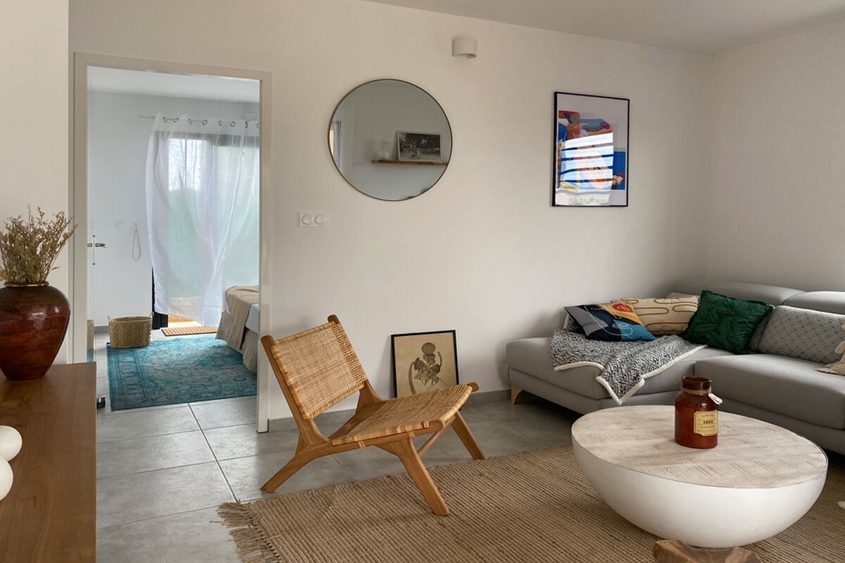 Charming bungalow for 2 people located quietly in the garden of a property. A 20 m2 bedroom with air conditioning, 160 cm bed, bathroom with shower and toilet, equipped kitchen on the terrace, Wi-Fi. 5 minutes from Basse-Terre and La Soufrière, shops nearby.