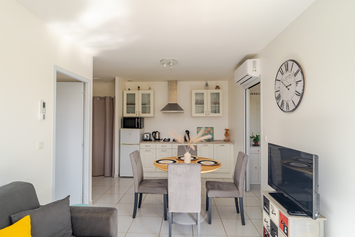 Enjoy a sunny stay in Claira! Cozy apartment of 30 m² for 2 people, with private terrace of 20 m². Equipped kitchen, air conditioning, Wi-Fi, modern bathroom. Heart of lively village, walking markets, the beaches of Toreilles, Canet en Roussillon and Sainte Marie de la Mer are 10 min, 5 min from the airport and 10 min from the highway, 10 min from the Christmas market of Barcarès. Easy parking. Calm, authenticity and Mediterranean sun guaranteed!