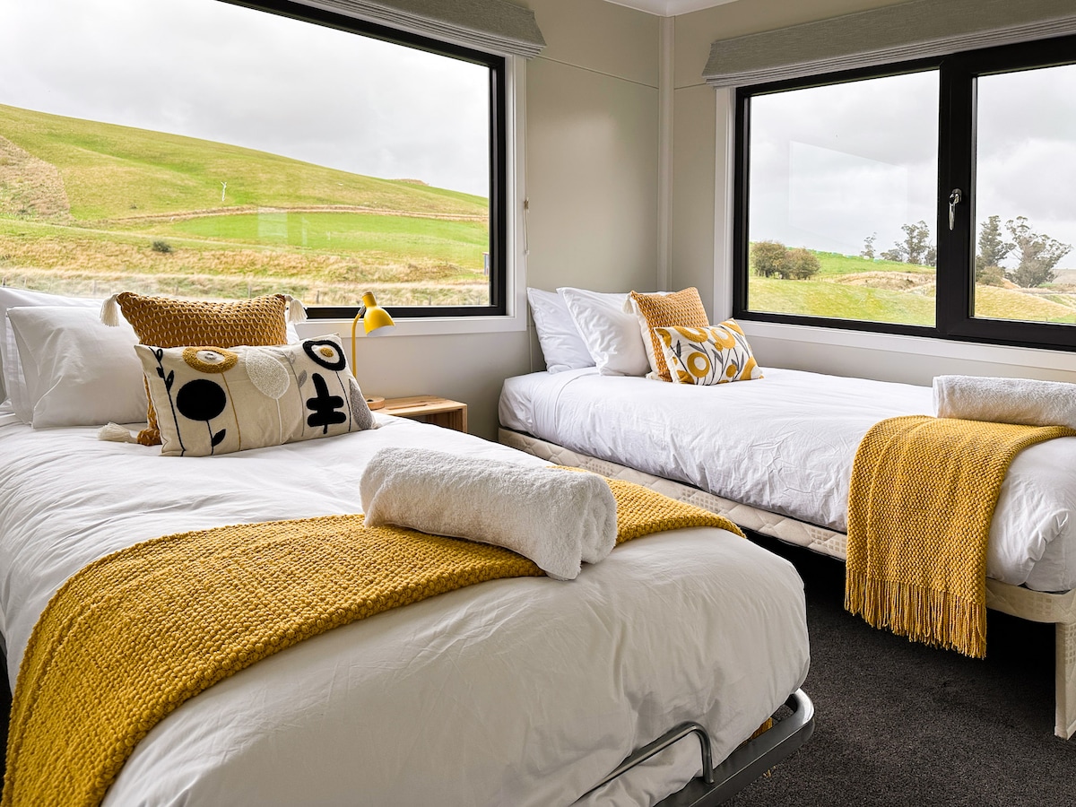Relax and enjoy stunning 360° rural views from this cosy, modern cottage on our working honey farm. Conveniently located on SH1, next to the cycle trail and just a few kilometres from Lake Waihola or a 35 minute drive from Dunedin ... this is the perfect place to relax after a long day. With a full kitchen, you can be self-sufficient or choose from several other dining options. TV, books, games, and even friendly sheep for your entertainment! Light continental breakfast also included.