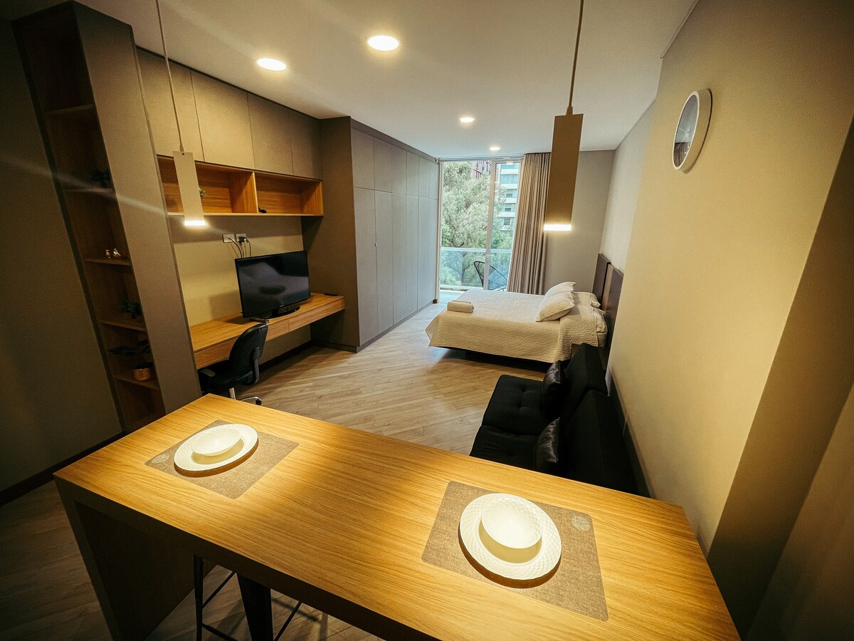 [Spanish, English, French] Bright and comfortable new studio apartment, in the best area of Cochabamba near shopping malls, restaurants, parks, financial institutions, markets, supermarkets, bars. Common areas include infinity pool (heated on weekends and holidays), barbecue, free washing machines, Netflix TV. We look forward to welcoming you and making your stay a pleasant one.