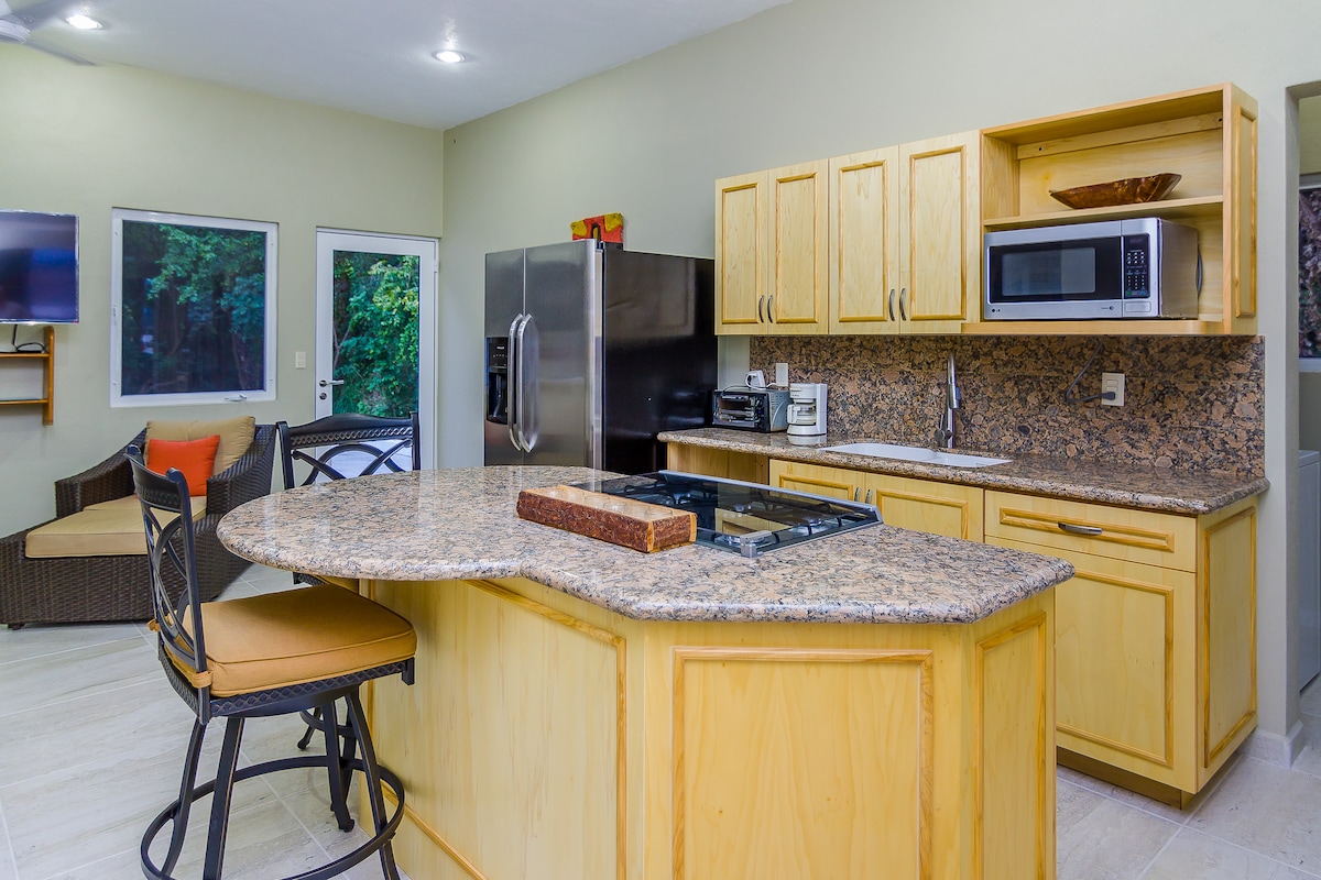 Brand new suite now available ! All the comforts of home in this 700+ square foot suite. It is a one bedroom air conditioned, with a new luxurious king size mattress. We have a full kitchen, great living room space with 55" Samsung TV, private outdoor patio with a plunge pool and small Weber BBQ