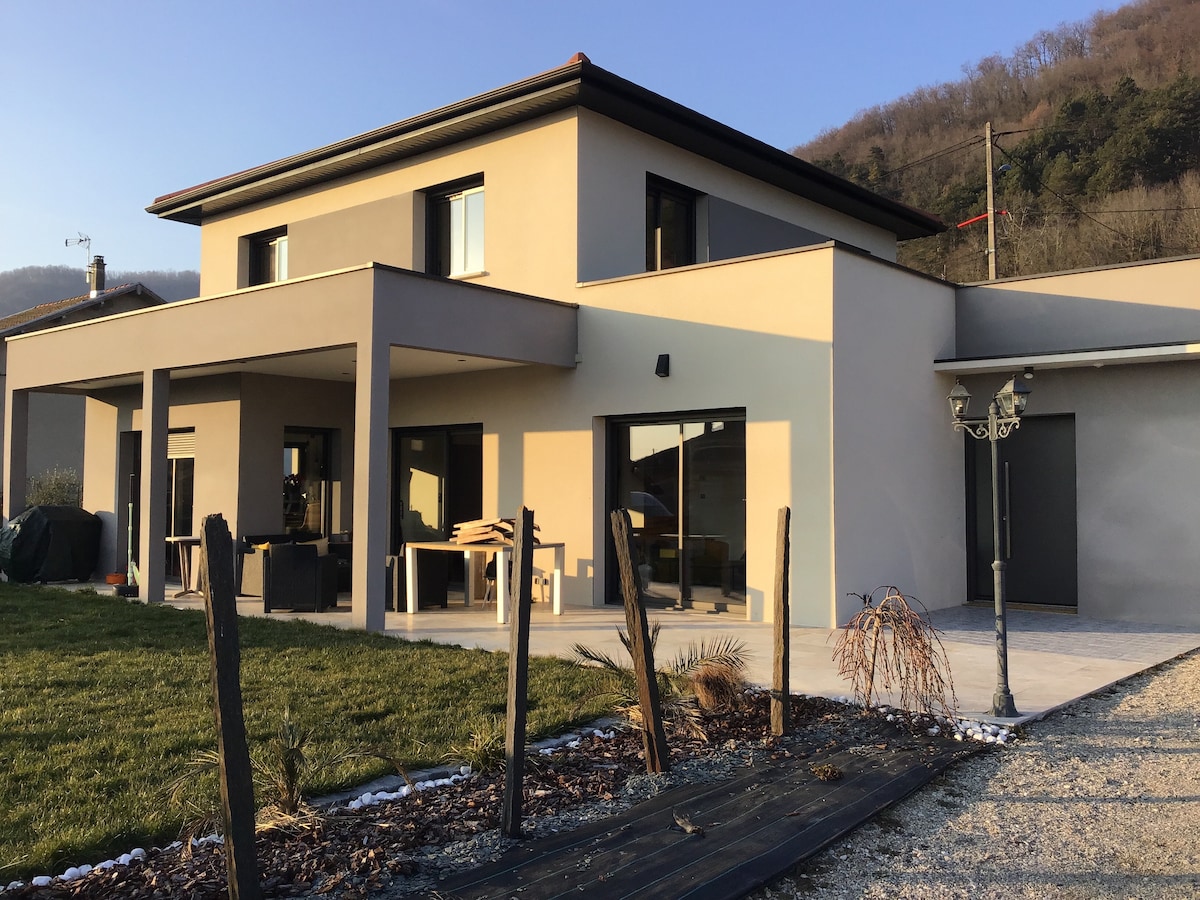 3 large bedrooms, independent apartment of 80 m2, ground floor, very well equipped country house with 2500 square meters of garden and splendid views of the mountains. Enjoy this stay in absolute calm at the foot of a green hill. Ideally located close to Lake Paladru, the Vercors and Chartreuse massifs. 15 min from Voiron and 30 min from Grenoble. Secure parking in our courtyard, garden table and chairs and small BBQ. Supermarkets 5 mins by car and bakery on foot