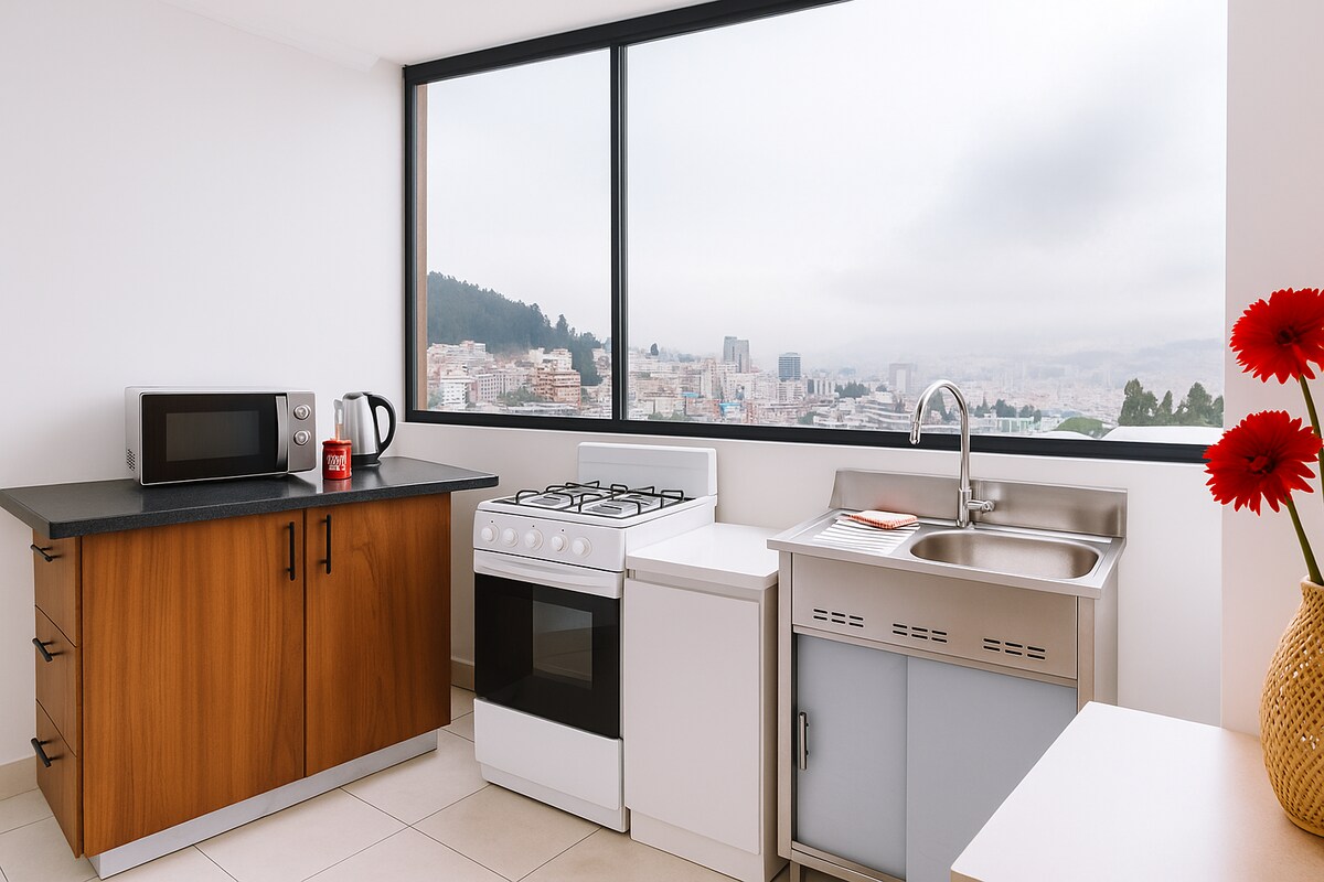 Modern, brand-new studio on the 14th floor with direct views of La Carolina Park. Studio amenities: • High-speed fiber optic WiFi • 55” QLED Smart TV • Ultra-comfortable bed • Fully equipped kitchen • Modern bathroom • Smart lock • 24/7 security Social areas (17th floor): • Gym • Coworking area with WiFi • Game room • BBQ area • Jacuzzi (available only for stays longer than two nights) Prime location, just 15 minutes from the Quito Metro, malls, and restaurants.