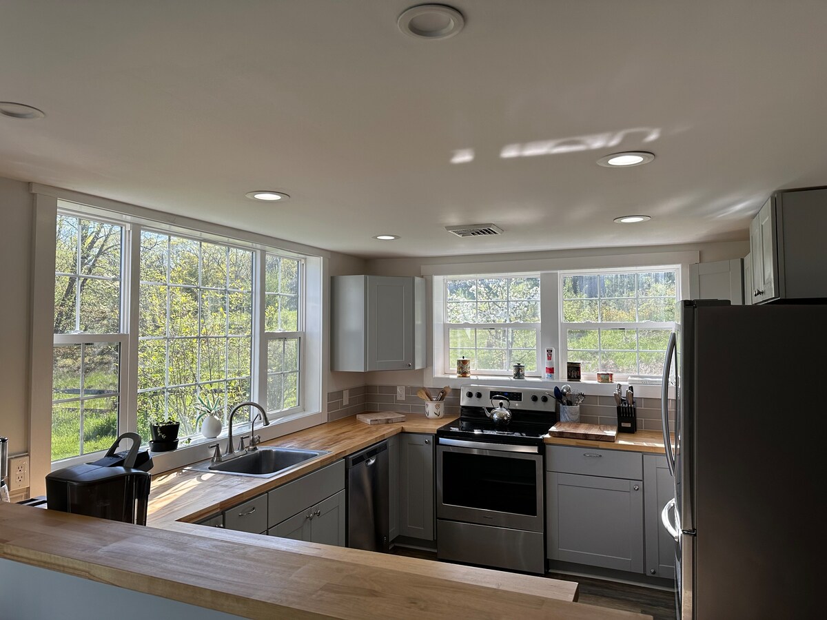 Beautifully renovated modern cottage in the village of Red Hook has modern amenities, hardwood floors, and an open floor plan. The cooks kitchen has an island and high-end appliances. Walls of windows and doors bring in lots of light and there's a private patio out back. Bathroom has large walk-in shower. Bedroom has a king bed (or two twins) and a recliner for reading. A 3 minute walk from center of Red Hook and Bard Shuttle. 10 minute drive to both Bard College and Rhinebeck.