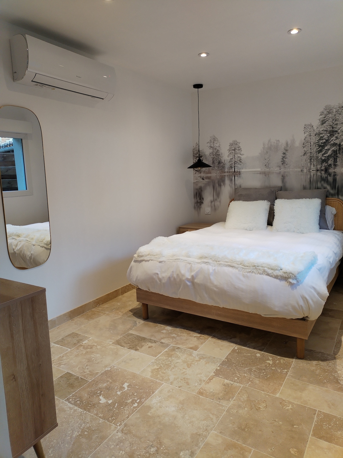 Fully independent air-conditioned apartment at the back of a property. It is composed of a large bedroom with a double bed. A fully equipped and air-conditioned lounge/kitchen area. A clic-clac that can be used as an booster bed for children or teenagers. A covered terrace with table, chairs and barbecue. Possibility to return your vehicle. Parking at the foot of the accommodation. Close to village center and all commodities on foot.