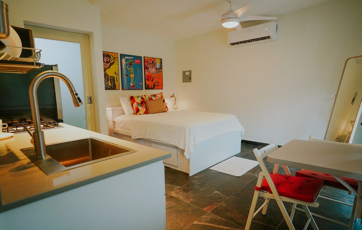 En el mismo corazón de casco Urbano de Comerio, PR encontrará este acogedor, elegante y amplio estudio para 2 personas. A solo 45 minutos de San Juan, Casita Basquiat le permitirá tener la experiencia de un típico pueblo rural de Puerto Rico. Aventúrese a visitar nuestros ríos, restaurantes, plaza y demás atracciones, pero sobre todo comparta con nuestra gente al caminar por nuestras calles. Compartimos con usted un espacio mágico en el centro y corazón de Puerto Rico.