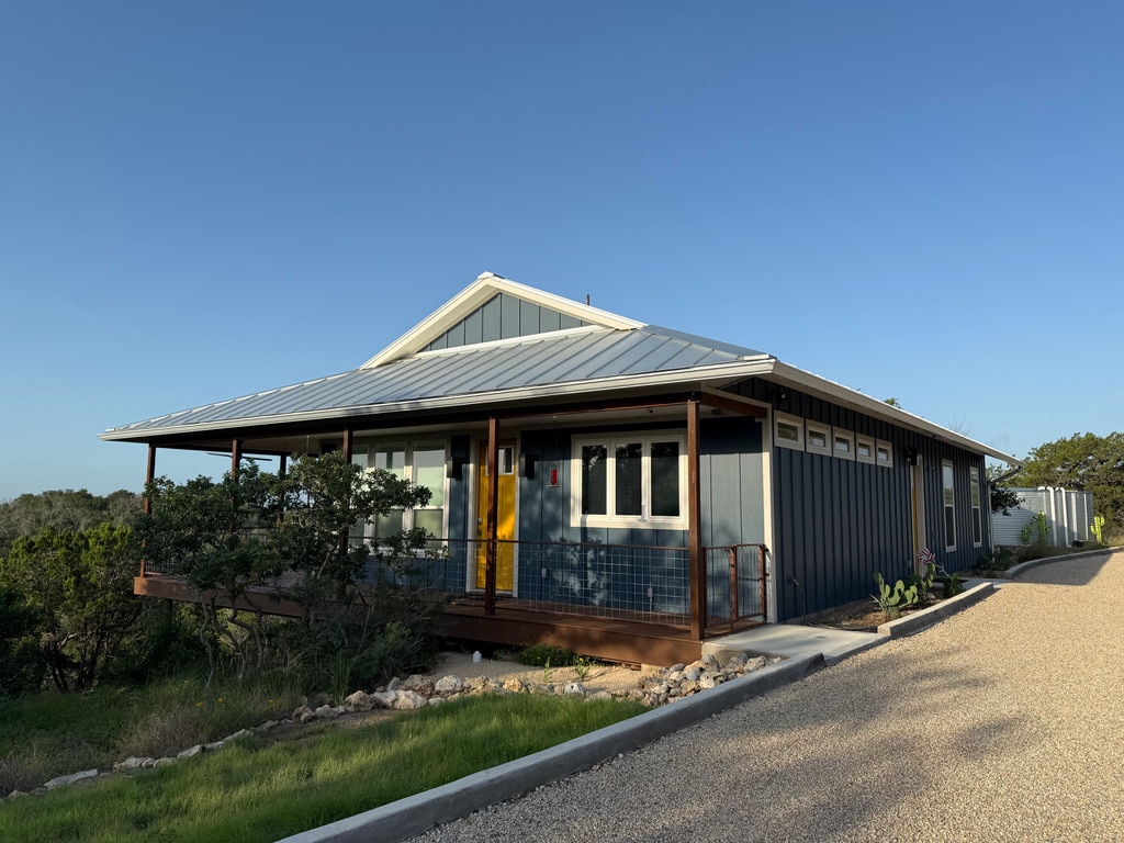 Designed to connect with the natural systems of a special place, Chertecho sits among the trees on a 5-acre rocky slope overlooking the Pedernales River Valley. An outdoor stair system connects the three levels - a covered rooftop deck; a second-floor master suite; and a ground floor kitchen space. Glass walls open to the wooded slopes of Big Hill, a ridge separating the Pedernales and Guadalupe watersheds halfway between Comfort and Fredericksburg. A place to unplug, and reconnect.
