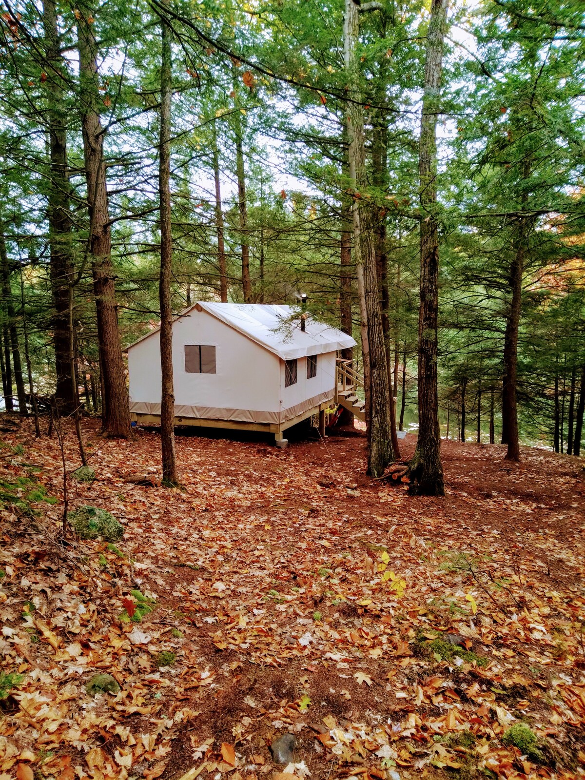 We are offering a beautiful, COMFORTABLE, option to camping. Our off grid tent comes with all the comforts of home including a wood stove and reading nook! It is nestled into a hemlock grove overlooking the active beaver pond. Walking trails and local activities at a stones throw. If you have a small boat or kayaks- BRING them! We have space in the yard and lots of local places to send you to get good use out of them. Please do not use on our pond. We have a boat available for use.