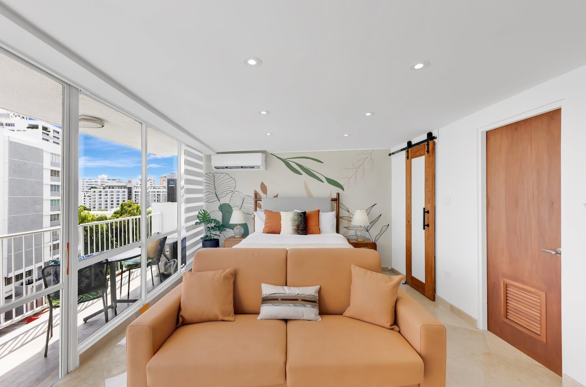 Newly renovated studio apartment directly across the street from easily accessible Condado Beach in San Juan. It's less than 10 minutes away from the airport and centrally located within walking distance to restaurants, bars, casinos and shops. Enjoy the beautiful ocean views from the balcony, and the many amenities this property offers, including a “work from home” space.