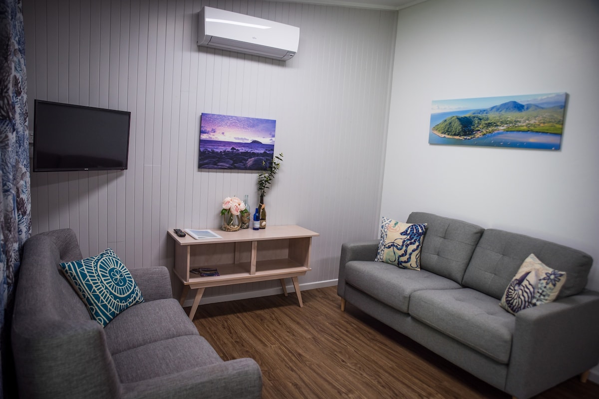 This renovated, self contained unit is one of four, situated at the base of iconic Grassy Hill. The one bedroom, ensuite bathroom unit is light and cool, decorated in a coastal, modern retro style. The kitchenette has an induction cook top, microwave and all the essentials to prepare simple meals should you wish. Tea and coffee making items are provided. The bedroom has a very comfortable queen bed with quality linen. Toiletries are provided. The second bed is a double sofa bed.