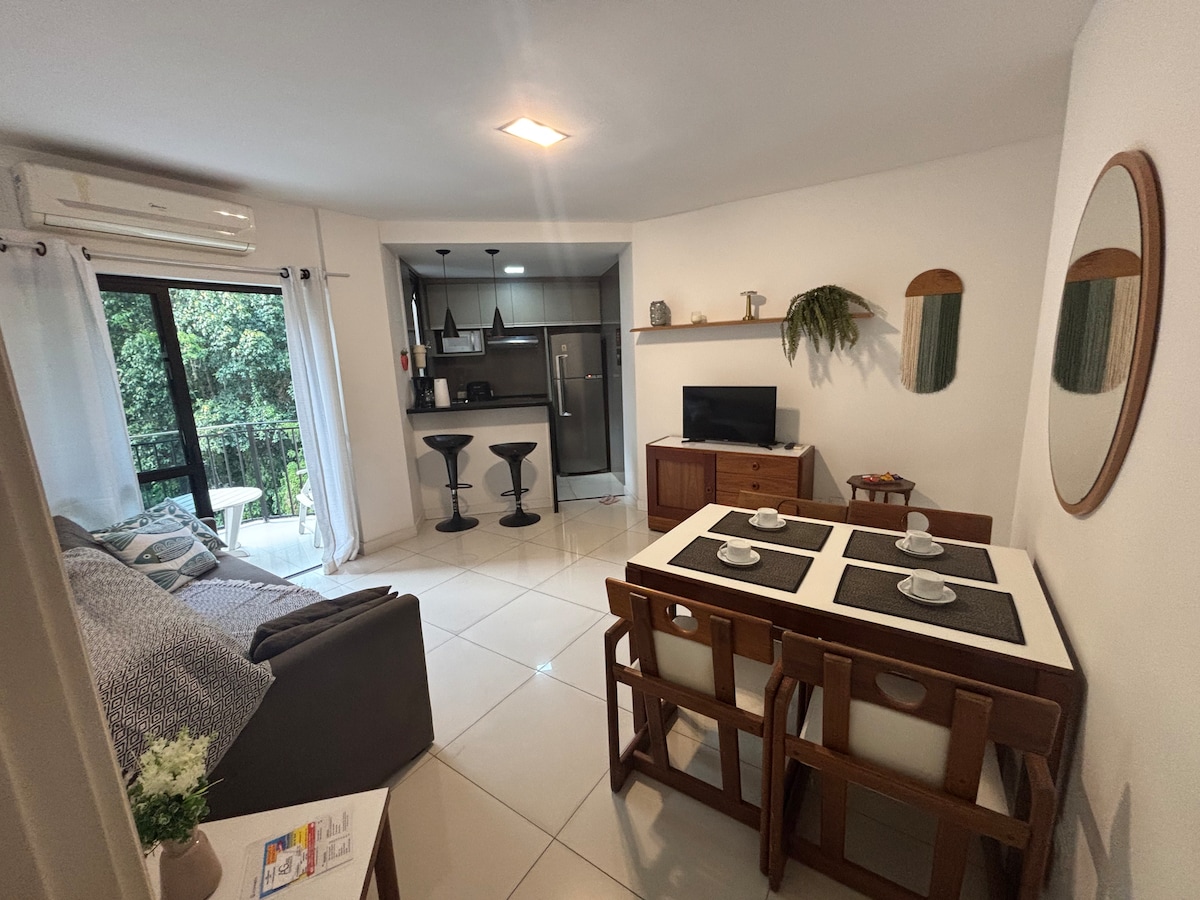 Modernly refurbished, comfortable, and luxurious single bedroom apartment. Conveniently located inside a hotel, just steps away from the beach, restaurants and Rio Sul Mall! Close to the most popular tourist spots, to public transportation, at the safest part of Copacabana (24 h police presence at hotel door!). This unit features all hotel services, including daily cleaning service included in the day rate. Stunning blend of modern luxury and unique architecture with the privacy of a forest view