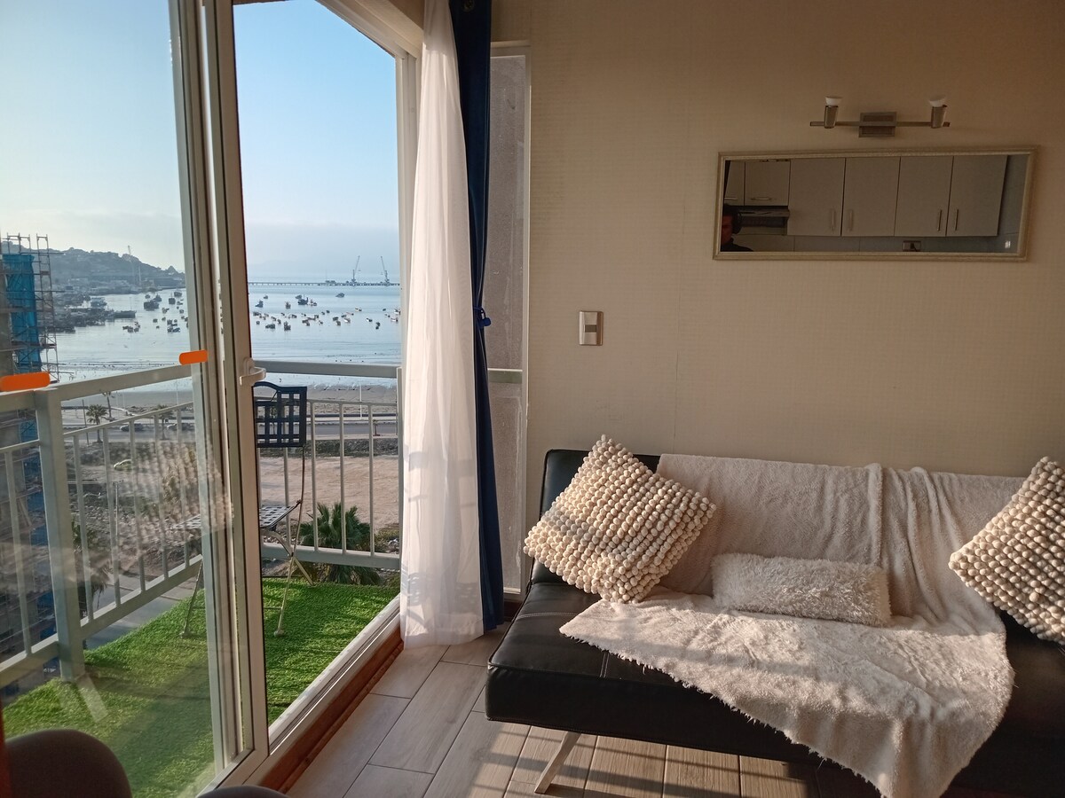 Escape to Coquimbo! Cozy apartment for 5 people facing the beach, with 2 bedrooms (double bed, bunk bed and sofa bed), fully equipped kitchen, Wi-Fi, washer/dryer, 24-hour surveillance, private parking and elevator (13th floor). Located just 2 blocks from Mall Vivo, downtown, supermarkets, bus terminal, cove, next to local fair and activities such as pirate boat rides. Ideal for relaxing, enjoying the sea, and exploring the area. Book your stay and live the experience!