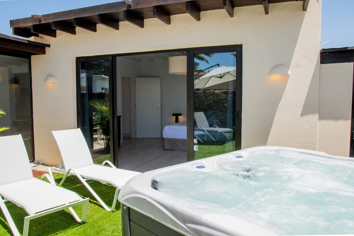 Fully refurbished bungalow boasting a large private roof terrace with sea views of Lobos and Lanzarote. Large quiet communal beachfront pool and paddling pool. (Just fully renovated). Situated within a small gated beachfront complex next to the popular surf spot 'Punta Elena'. We bought this property end september 2021 while it had 114 reviews with an average of 4,87 and hope to even improve this to make your stay a “memorable experience”