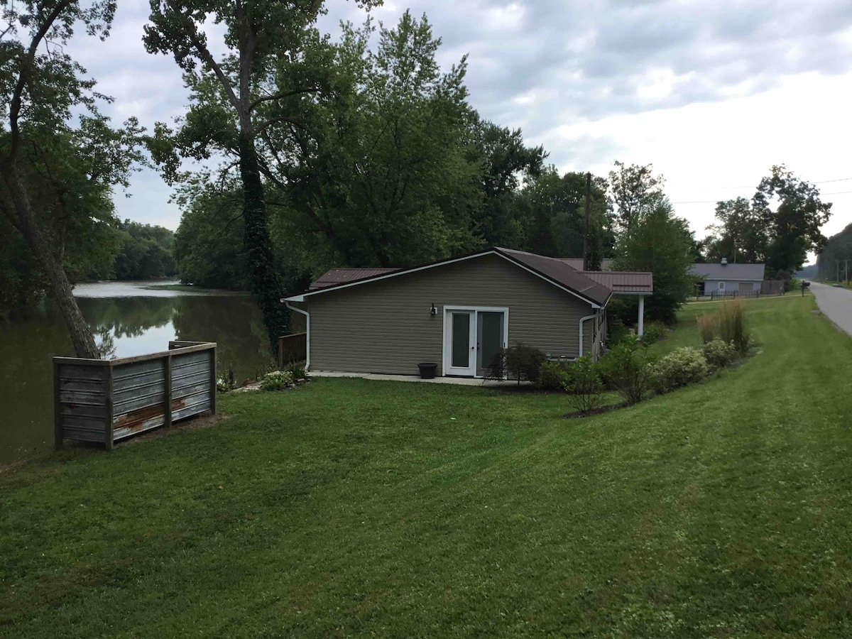 The Walhonding Hideaway is a 3 bedroom home on the Walhonding River. It sleeps 6 very comfortably and a 7th on the couch . While sipping coffee or cocktails on the deck you'll feel as if you are directly on the River. There is a beautifully landscaped bonfire area for nightly fires. You may even see Amish buggies stroll by some mornings. During your stay, consider taking the three rivers wine trail or spending the day in historic Roscoe Village.