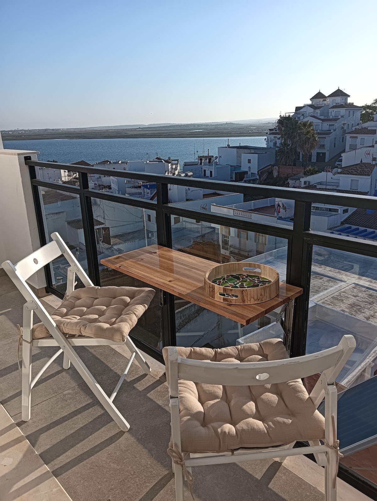 This light filled penthouse offers every comfort. Though minutes from the town center, this is a quiet getaway where swifts and swallows love to fly by. The house is filled with original art, pop decor and features a 3 meter long sliding glass door onto a balcony with river views. The private rooftop offers 280 degree views of Ayamonte, the Guadiana River and Portugal plus a pergola, fantastic chill out lounge, BBQ, outdoor shower and lounge chairs. Full kitchen and dedicated workstation.