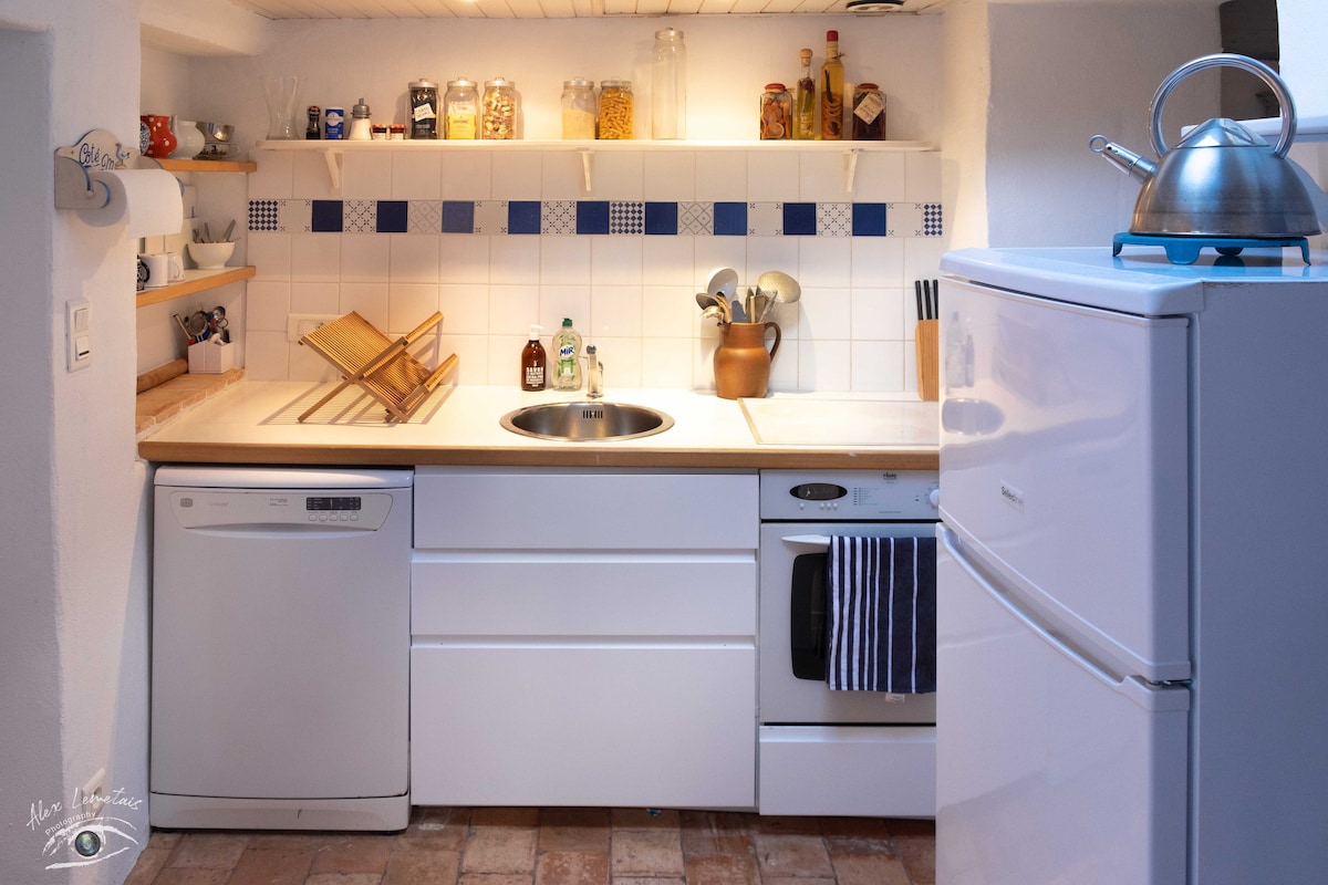 2 steps from the market, train station & 3 steps from the sea! Charming cottage, quiet via a green path. Open plan kitchen/living room overlooking 10 m2 southwest-facing terrace. Ground floor: bedroom (160), bathroom with toilet. In the attic, bedroom with 2 single beds, preferred for children/teens but can be joined together. Atypical place where the living is good and well-equipped (Nespresso coffee machine, plancha, Bluetooth speaker...). From 3 nights, cleaning fee & linen included. Otherwise, €25 per bed.