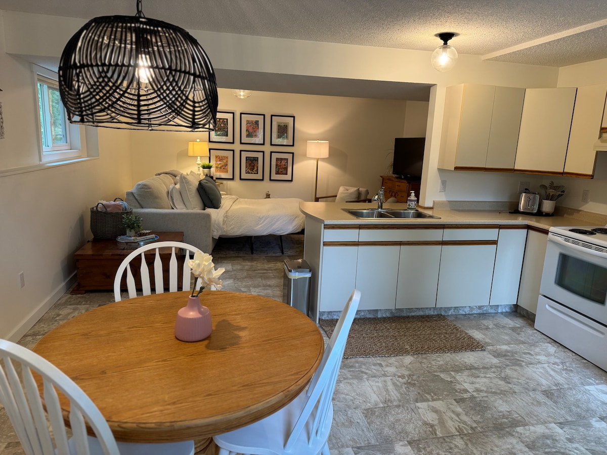 SMALL one-bed studio suite with a hide-a-bed (book for three if used). Private entrance & porch. Coffee, hot chocolate, and tea. Kitchen, Ruko & Netflix, WiFi, comfortable queen bed with luxurious high thread count sheets. , shower. This suite is BEST for a couple or small family due to lack of privacy. NOT for LIGHT sleepers, as you can hear us walking above you. If there are only two of you, but one of you sleeps on the hide a bed please BOOK FOR THREE PEOPLE. Children. Tesla charger: $10.