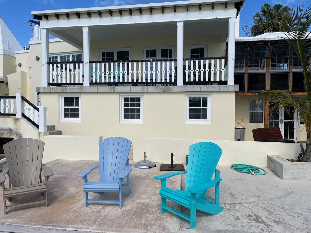 Cozy & compact, this delightful 1 bedroom/2 story waterfront hideaway affords a panoramic view of the Little & Great Sounds. On the water (walk across the lawn and jump in) with a large dock suitable for swimming, snorkeling & spectacular sunsets. "Sea Breeze Mews" is only a 10 minute walk to picturesque Church Bay beach & a short bus ride to all the magnificent South Shore Beaches. Restaurants and award winning Golf courses are only a few minutes away. Public transportation right outside gate.