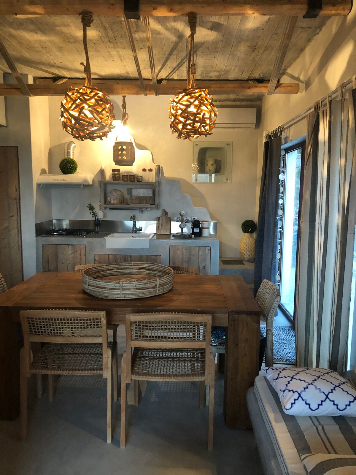 Welcome to your dream villa, built in contact with a rock formation! This residence offers two bedrooms with private en-suite bathrooms. (1 with extra sofa bed) The villa is situated on an 6000m2 plot filled with pine trees and olive groves. Several steps lead down to your secluded beach.The kitchen and the dining room in the aithrio feature panoramic sea views.The outdoor spaces of 120 m2 include a sitting area protected by a shading pergola,sun loungers an outdoor dining place,barbeque, shower
