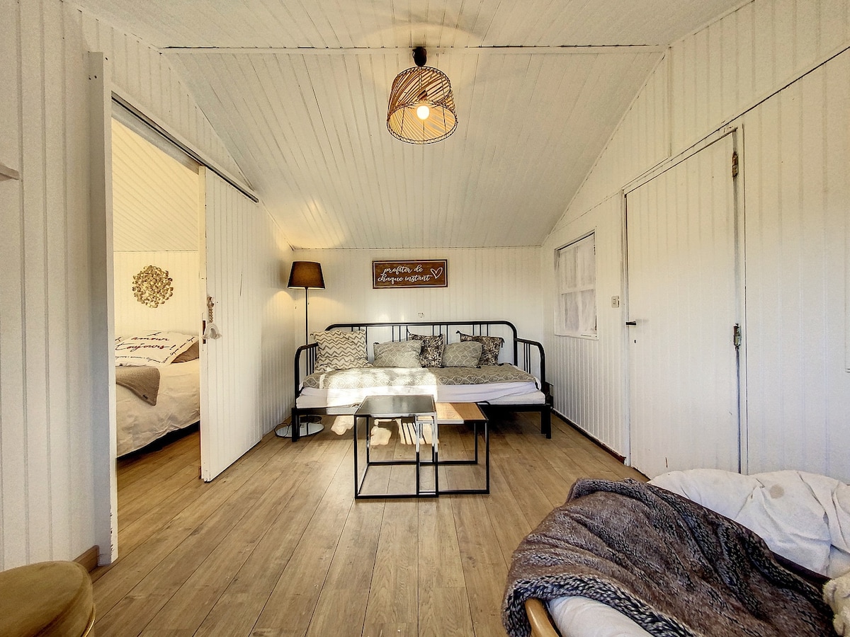 Nous vous proposons ce charmant chalet de 20 m2 avec un jardin de 70 m2. canape lit avec matelas de 17 cm d epaisseur. Il est situé à 1,3 kms de la plage Boccacabana, 5 min en vélo, 3 min en voiture. A disposition il y'a 2 VTT musculaires . Bus à 2 min qui vous amène à Cannes en 15 min. Nous nous trouvons à 5 min de la zone ind. Ce chalet est situé dans notre propriete mais vous n 'aurez aucun vis à vis avec nous. JACUZZI A DISPOSITION A PARTIR DE 4 NUITS MINIMUM