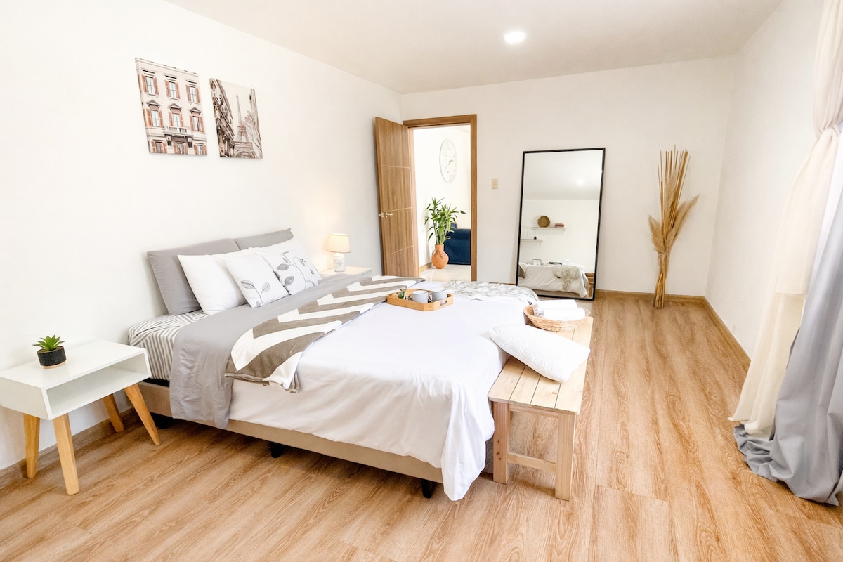 Relax in this brand new, cozy and comfortable apartment that hosts 4 guests. Start your day with a coffee on a delightful and relaxing private terrace . It has 2 spectacular master rooms with queen beds perfect to rest. The place is equipped with appliances for a unique stay; washing and dryer machines are available for you. It has an amazing location at a walking distance to the historical center. Perfect for visitors that love confort, designer style and good location.