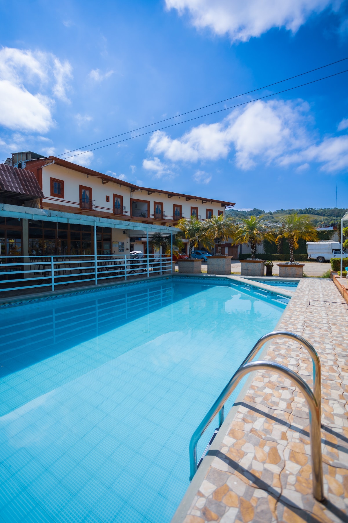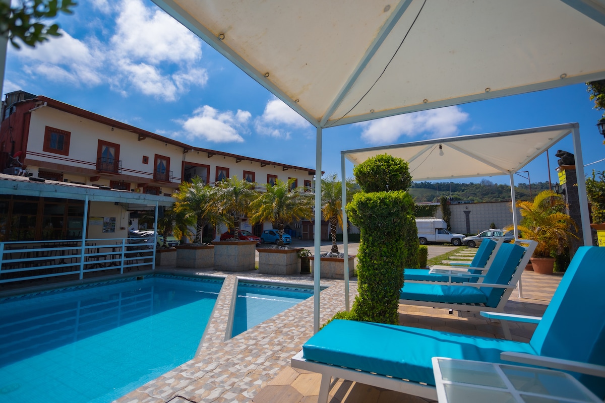 Cómoda habitación de hotel con cama King Size. Contamos con alberca, restaurante, estacionamiento y áreas verdes. Estamos sobre la calle principal a tan solo 3 cuadras del centro histórico. Cerca de este alojamiento hay muchos atractivos turísticos como la poza “Pata de Perro”, Cascada “Las Brisas” y la Zona Arqueológica de “Yohualichan”.